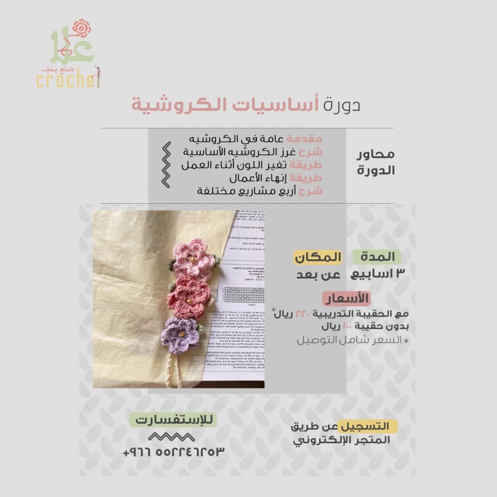 تبدا الدورة بشرح ادوات الكروشيه المستخدمة ثم شرح طريقة عمل الغرز الأساسية وتغير لون الخيط وانهاء العمل